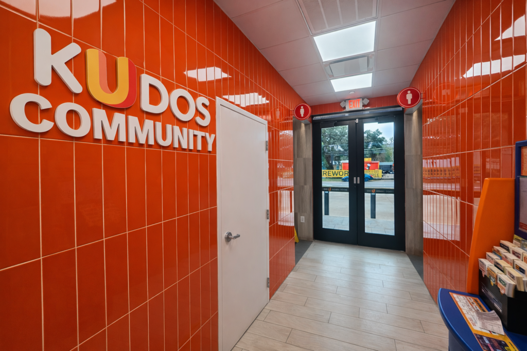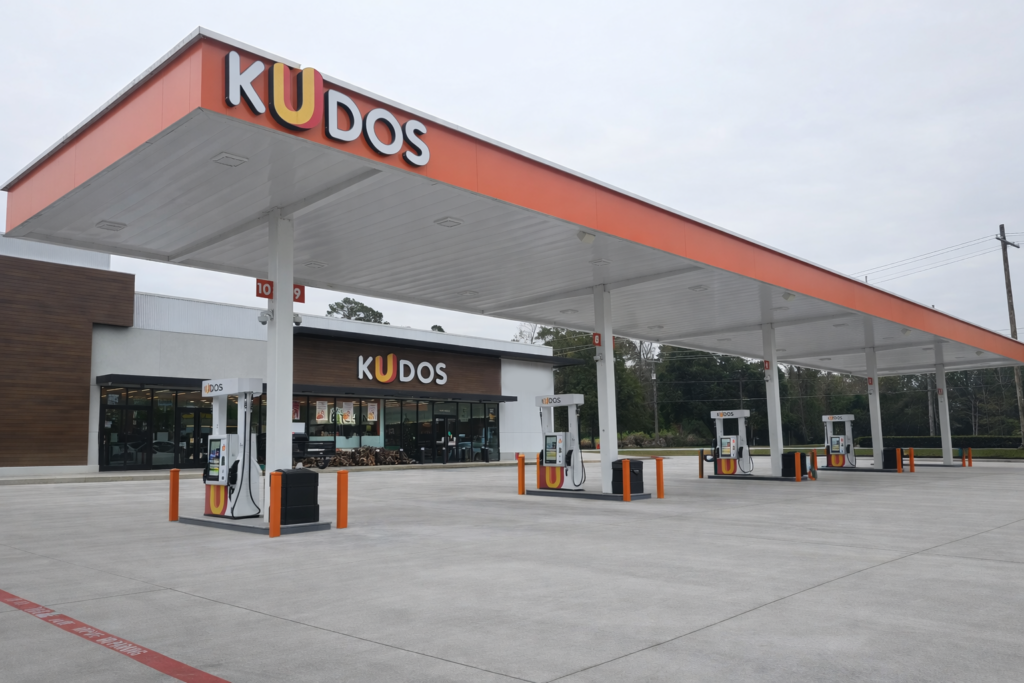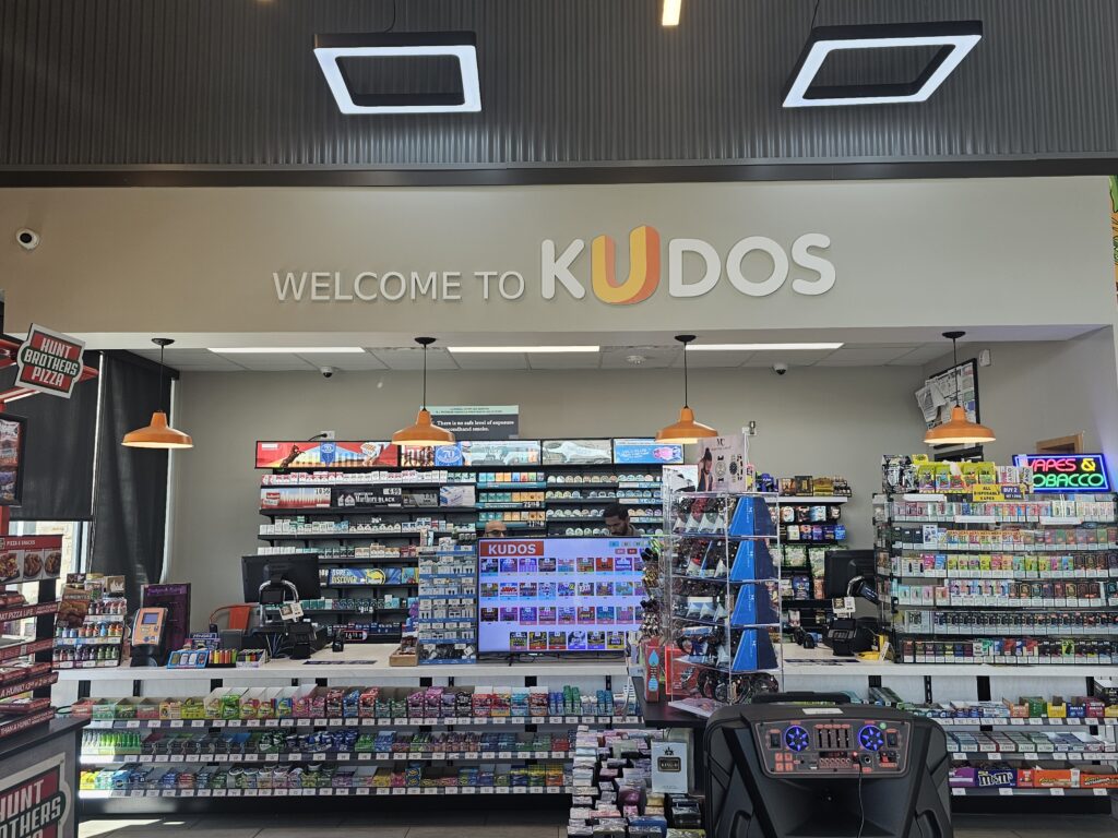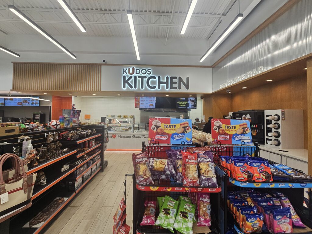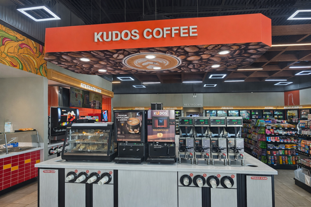 Kudos refreshment areas are stocked with full-service bean-to-cup espresso bars and cold beverages such as fresh squeezed lemonades. Kudos product selection includes snacks and sweets you crave, including delights from local artisans. Kudos is a place where you feel welcomed and want to return – smiling faces, excellent customer service, comfortable eating areas, and, yes, clean bathrooms!